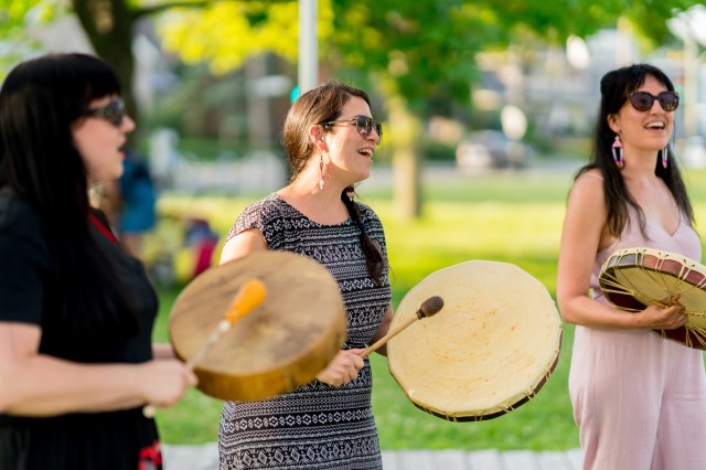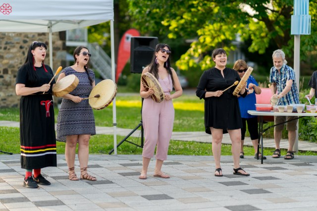 Based in Montreal, ODAYA is collective of Two-Spirit, women, and non binary Indigenous artists and musicians well know for their concerts and performances that celebrate the richness of Indigenous cultures on Turtle Island. The name Odaya comes from the word odemin, which means “strawberry” in the Anishinaabemowin language. It is translated in English by “fruit of the heart” due to the form of the berry when it is sliced in two parts. The love and kinship shared among Indigenous Two-spirit, women, and non binary folks are at the heart of the performance work of this group. ODAYA participates in activities and demonstrations that raise public awareness of the rights of First Nations and calls for Indigenous spaces for folks of these communities that have been rendered invisible. In this spirit of re-appropriation and reclamation of erased urban Indigenous spaces, the collective created two performances in the Verdun borough.