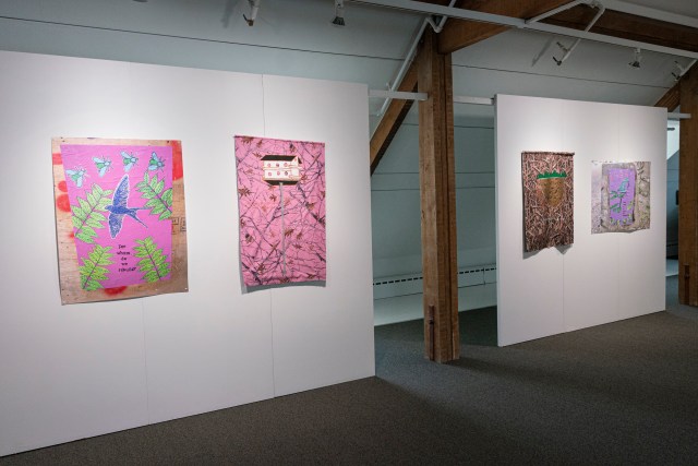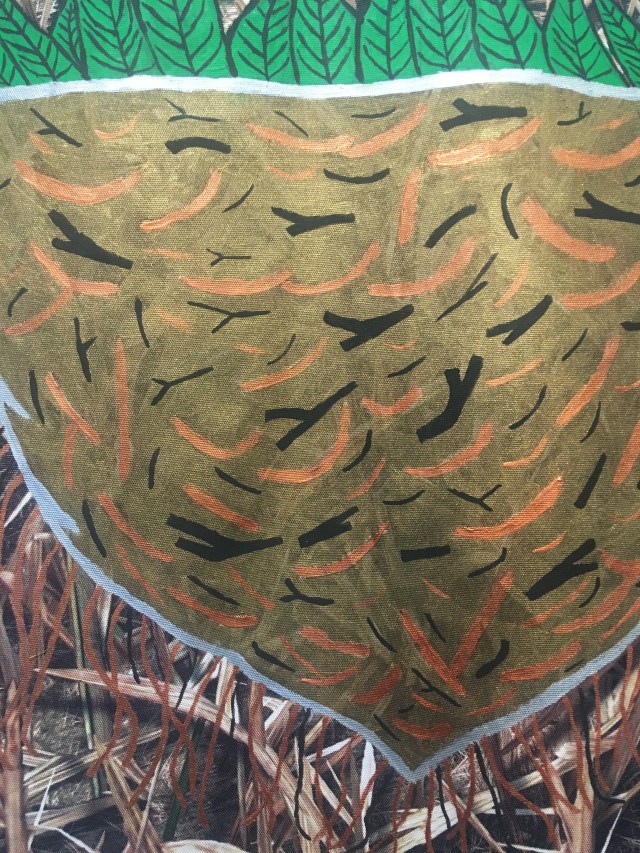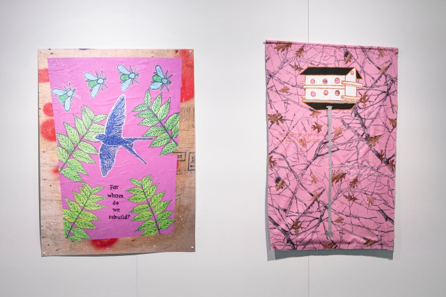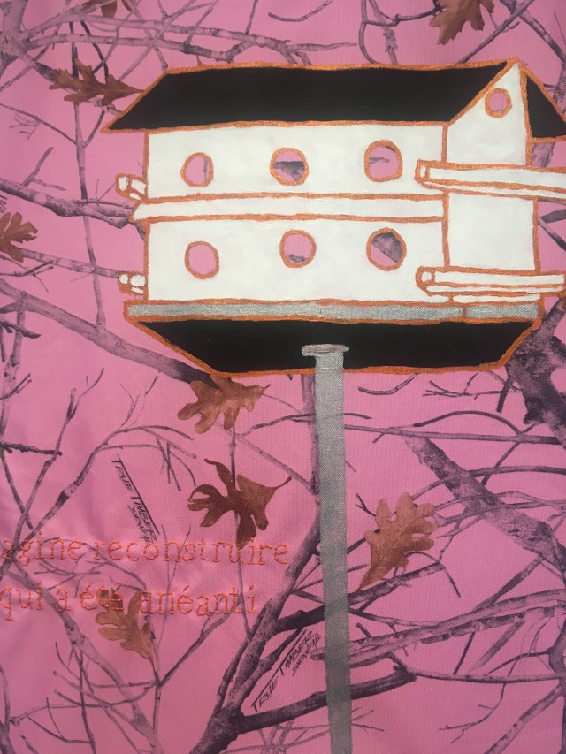 Imagine rebuilding what was destroyed / Imagine destroying just to rebuild is a textile installation with a painting of a bird’s nest built by the City of Pointe-Claire. The two sentences are embroidered on the fabric. The second textile installation, Imagine Shelters As Home, is a painting that represent the swallows’ natural nest and the sentence is also embroidered on the fabric.